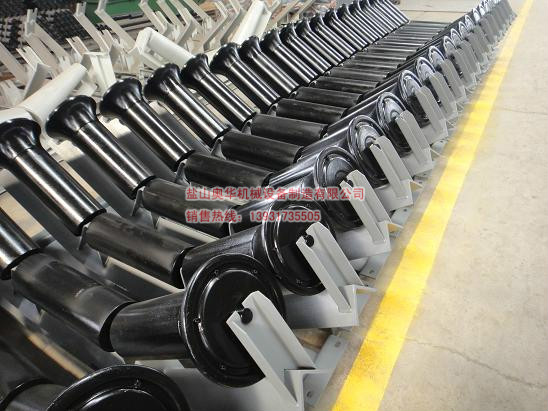 The self-adjusting idler roller group is an automatic adjusting roller. When the tape deviation, the belt side of the friction contact with the friction head, the internal friction plate friction plate has the appropriate resistance to drive the activities of the roller bracket deflection group, when the roller rotation direction and belt running direction inconsistencies, resulting in tilt Angle and relative speed, resulting in corrective effect on the belt.